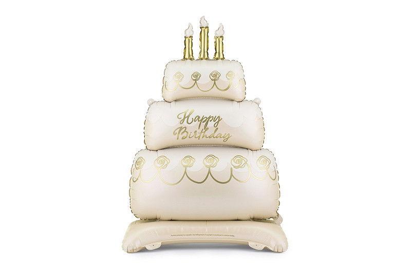 Stående folieballon formet som en kage i beige og guld – perfekt til fødselsdag og festlige lejligheder.