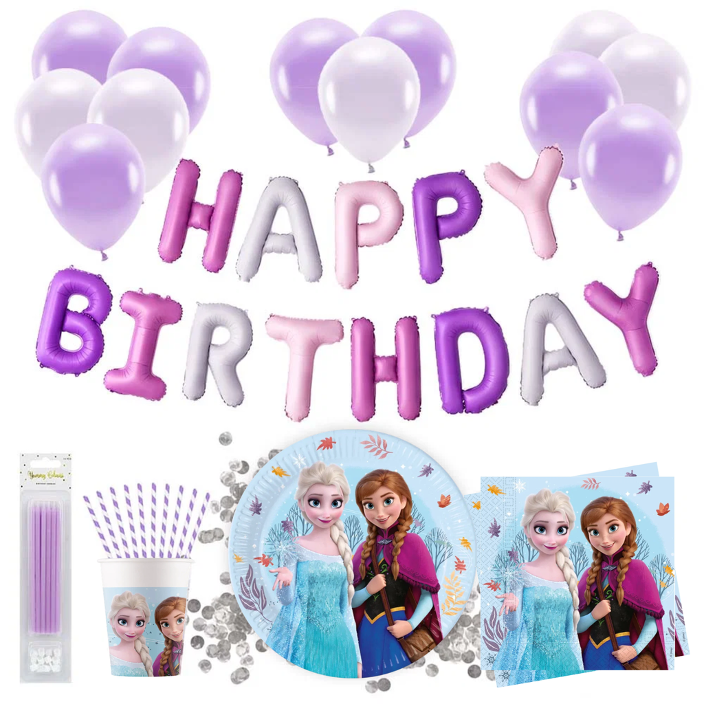 Fullmatat paket för Frost kalaset. Med detta färdiga kit får du all dekoration som behövs för Frost temat. Häng upp den stora folieballongen med bokstäver som bildar texten "Happy Birthday" i lila nyanser. Dekorera med ballongerna runt festligheterna. Bordet dekoreras med tallrikar, muggar och servetter i Frozen stil. Pigga upp dukningen med konfetti i metallic silver. När slutligen tårtan kommer in så lyser dom härliga tårtljusen i lila. Följande produkter ingår i detta Frost 2 kalas kit: