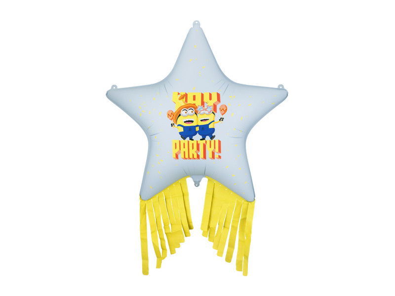Festlig folieballong i stjärnform med Minions-motiv och dekorativa tofsar – en riktig blickfångare på kalaset.