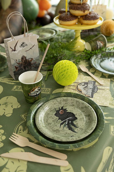 Runda papptallrikar i Jurassic World-tema – perfekta till fika, snacks och tårta på dinosauriekalaset. Tallrikarna kommer i en färgmix med grönt tryck som matchar övriga festtillbehör.
