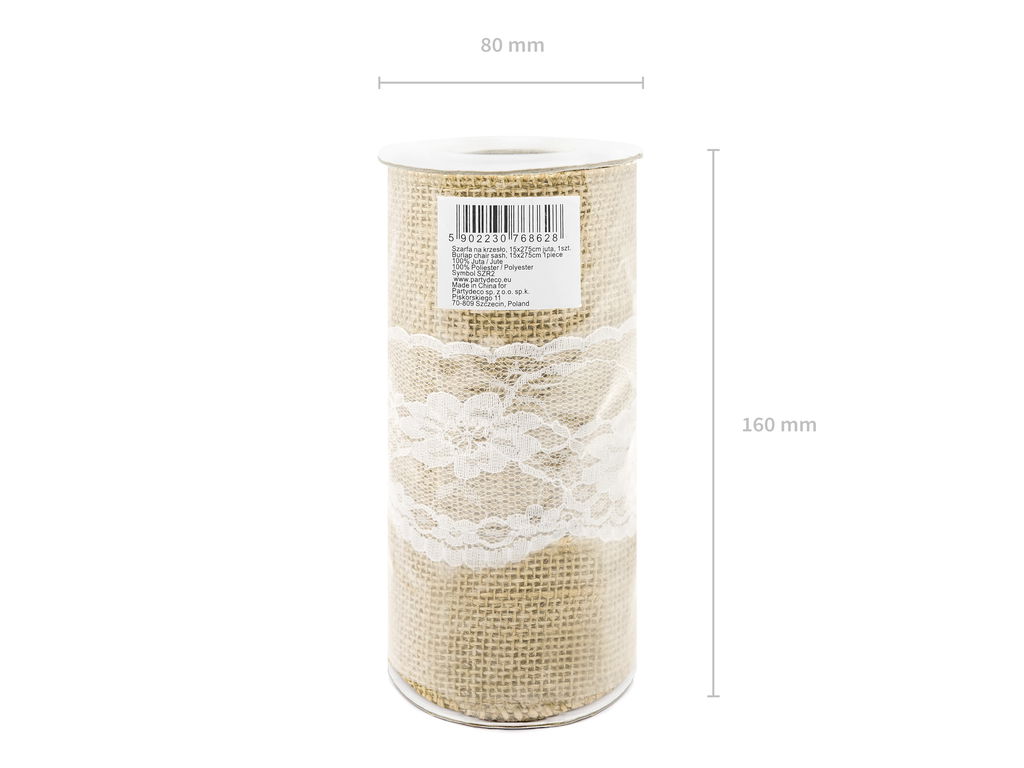 Skapa en romantisk, rustik känsla med denna stolsrosett i jute och spets. Perfekt för bröllop, sommarfester eller lantliga kalas där varje liten detalj räknas.